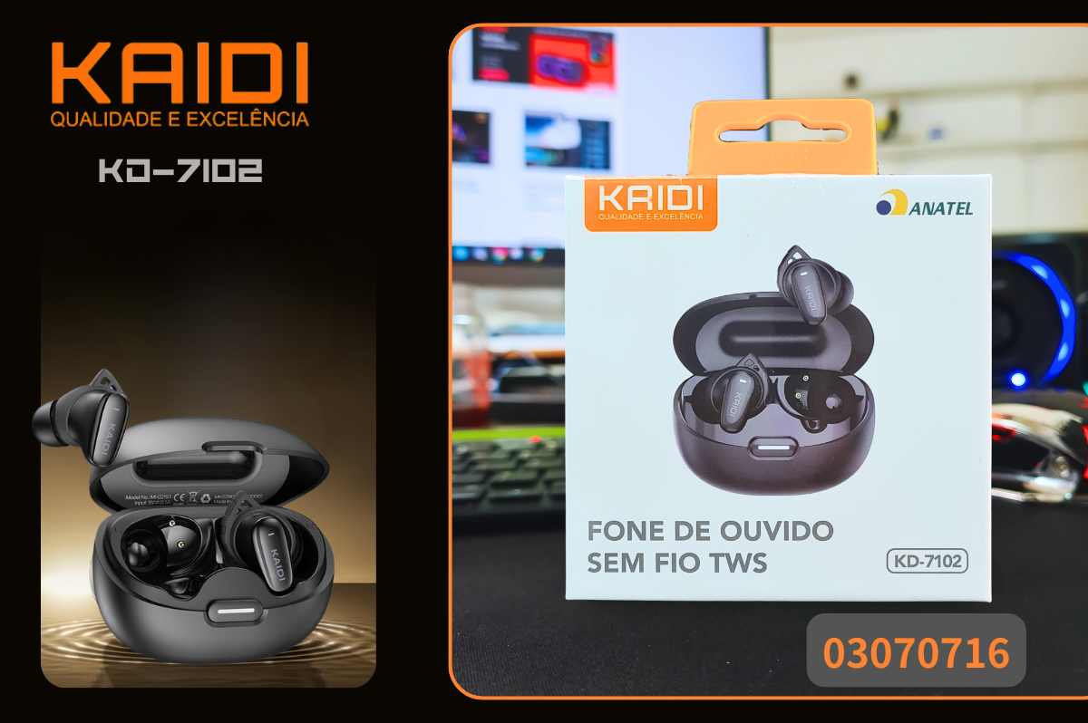 O Fone de Ouvido Bluetooth TWS KD-7102 da Kaidi proporciona som nítido e conexão sem fio de alta estabilidade. Equipado com Bluetooth v5.3, oferece baixa latência, emparelhamento rápido e alcance de até 10 metros.