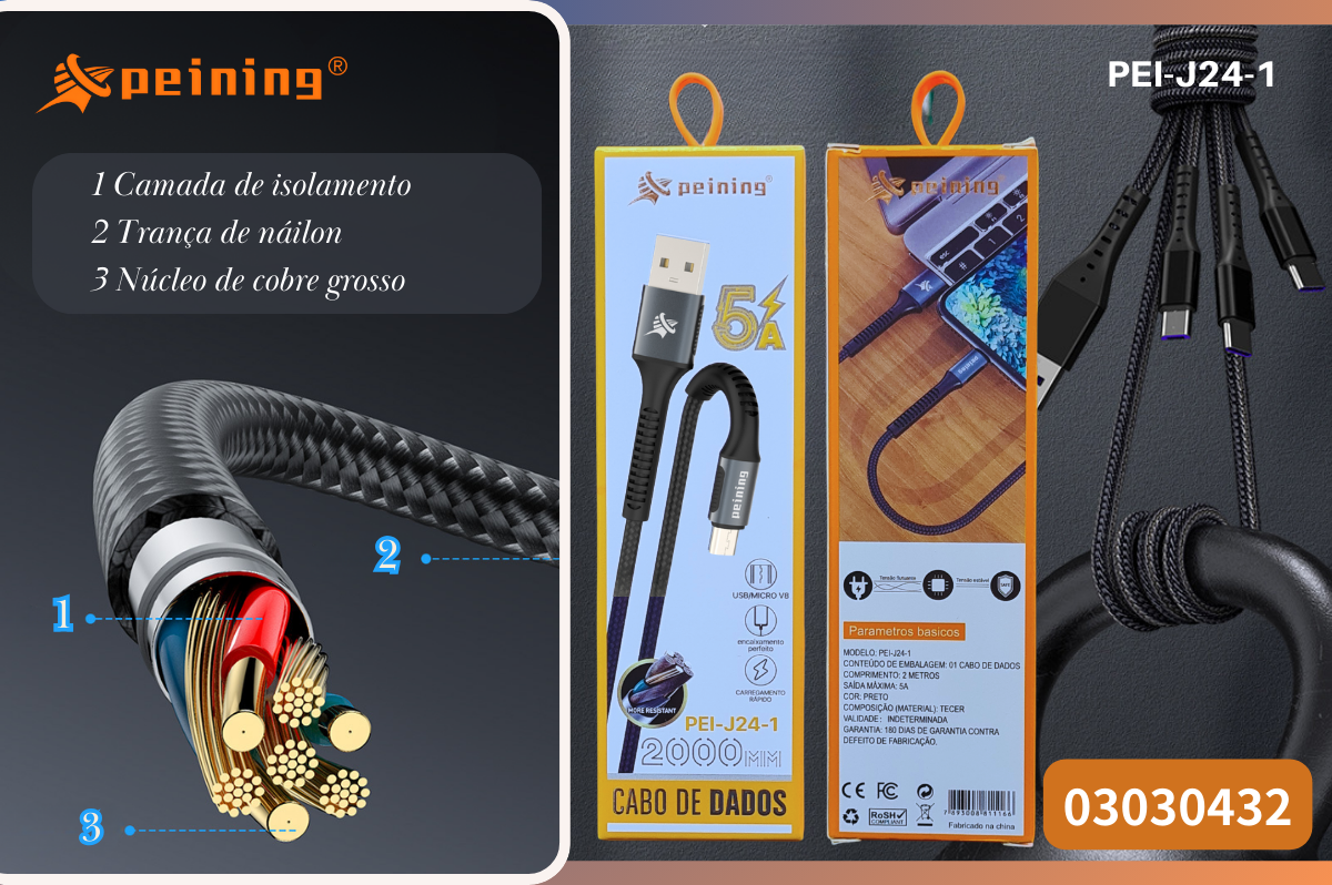 Cabo de Dados Peining PEI-J24-1 Alta Resistência e Carregamento Rápido
