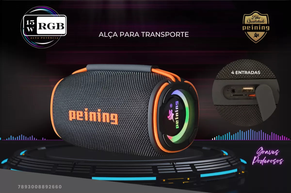 A caixa de som PEI-266BTS oferece uma experiência sonora única com projeções de LED RGB, permitindo atender ligações e sendo resistente à água, ideal para festas em qualquer lugar.