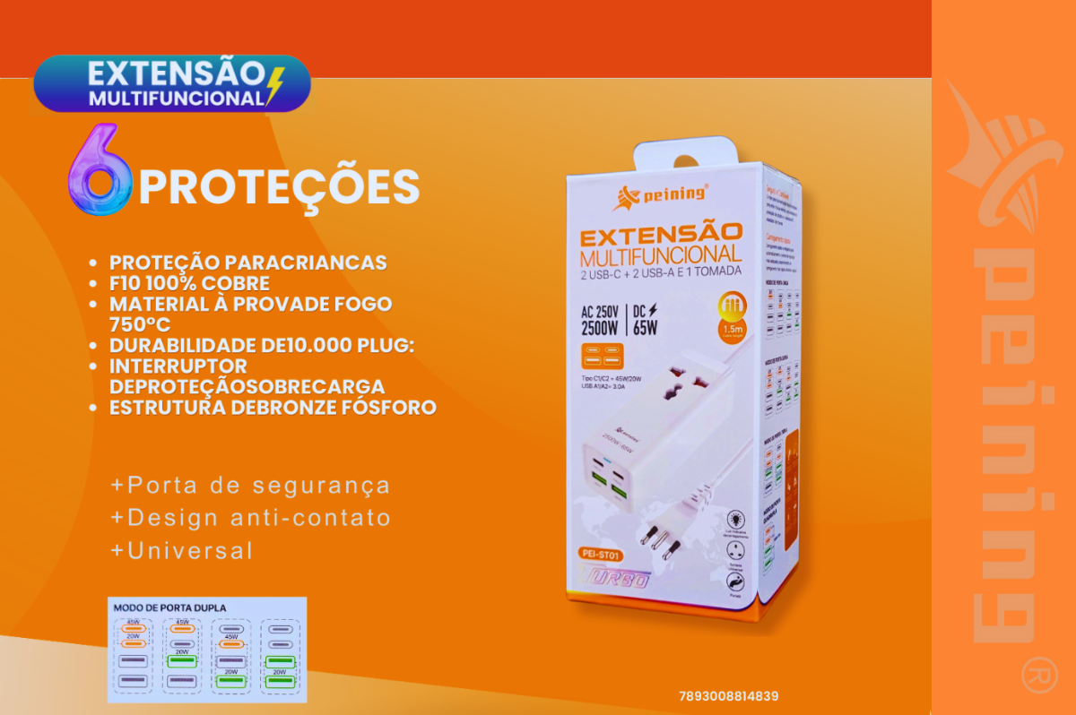 A Extensão Multifuncional PEI-ST01 combina eficiência, design compacto e versatilidade. Com 2 portas USB-C, 2 portas USB-A e uma tomada AC, ela é ideal para carregar diversos dispositivos ao mesmo tempo. Este produto é perfeito para ambientes domésticos, escritórios ou em viagens, oferecendo soluções rápidas e práticas para diferentes necessidades de energia.