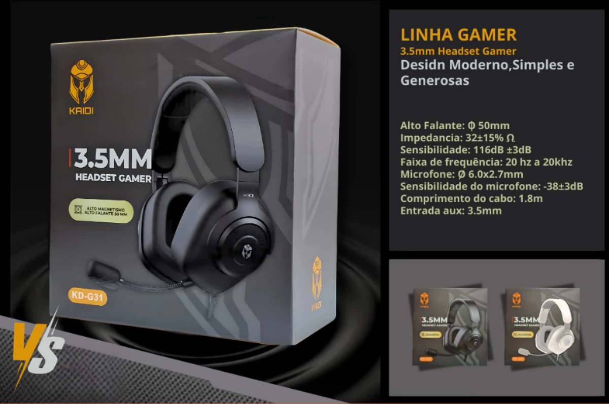 Conexão auxiliar de 3,5mm para compatibilidade com PCs, laptops, consoles e dispositivos móveis.