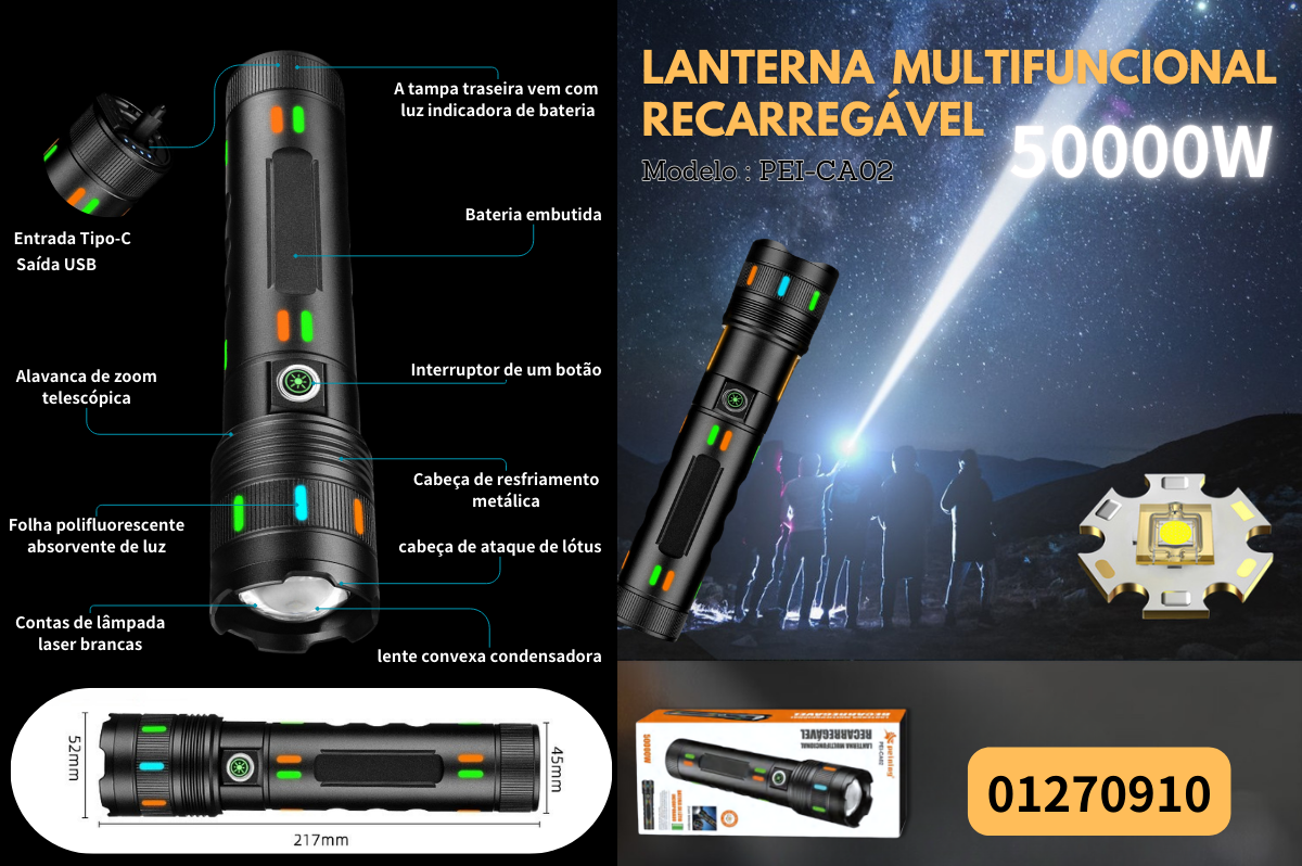 A lanterna PEI-CA02 combina potência, durabilidade e praticidade em um único dispositivo. Com impressionantes 50000W, é a escolha ideal para quem busca uma iluminação confiável para emergências, uso doméstico ou atividades ao ar livre. Seu design robusto e funcional proporciona segurança e eficiência em qualquer situação.