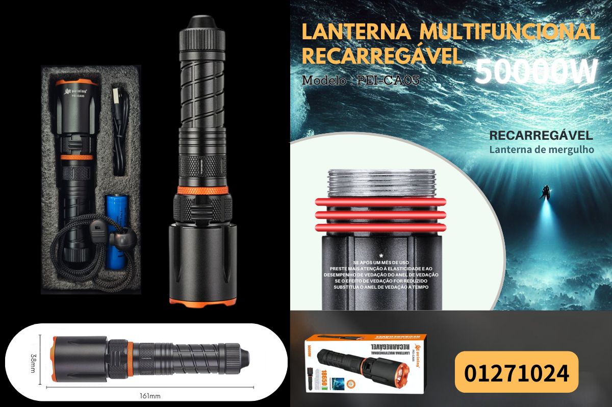 A lanterna PEI-CA05 foi desenvolvida para atender às necessidades de quem busca alta potência e resistência em ambientes desafiadores. Com uma potência impressionante de 50000W, é ideal para uso subaquático, atividades ao ar livre, emergências ou aplicações profissionais. Sua estrutura impermeável e robusta garante desempenho confiável mesmo nas condições mais adversas.
