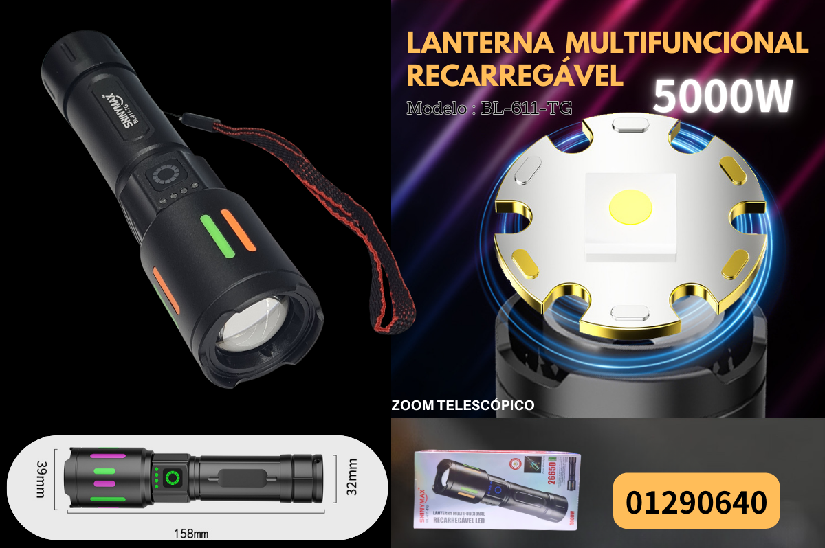 A lanterna BL-611-TG foi projetada para oferecer iluminação potente e confiável para uma ampla variedade de atividades em terra. Com zoom telescópico e alcance de até 500 metros, é ideal para caminhadas, acampamentos, pesca noturna e outras aventuras ao ar livre. Sua construção robusta em liga de alumínio garante durabilidade em ambientes desafiadores, mas não é adequada para uso subaquático.
