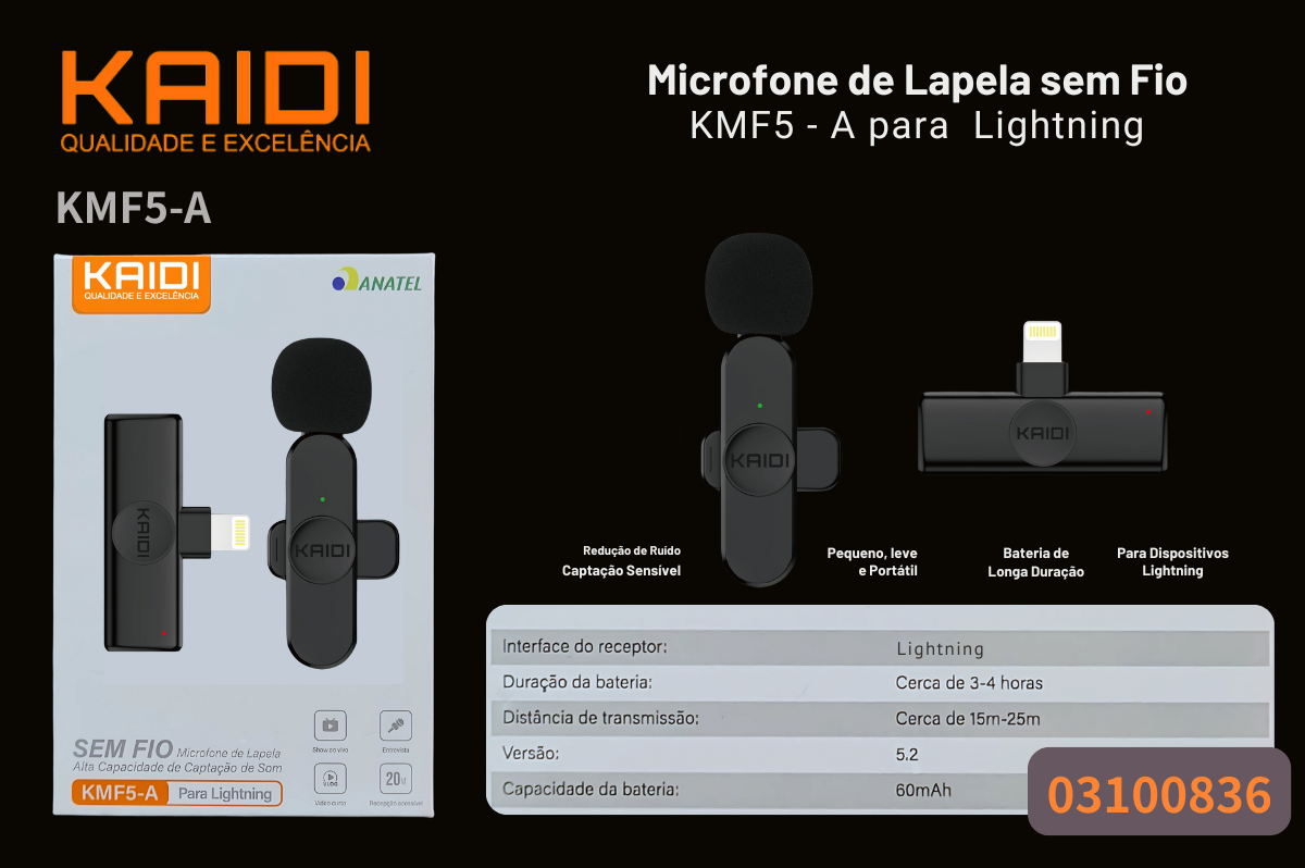 O Microfone de Lapela Sem Fio Kaidi KMF5-A é a escolha perfeita para quem busca qualidade de áudio superior em vídeos, entrevistas e vlogs. Com captação sensível e redução de ruído, ele proporciona gravações nítidas e profissionais. Leve, compacto e portátil, permite mobilidade total e praticidade no uso. A tecnologia sem fio via Bluetooth 5.2 garante transmissão estável a uma distância de até 25 metros, sem interferências.
