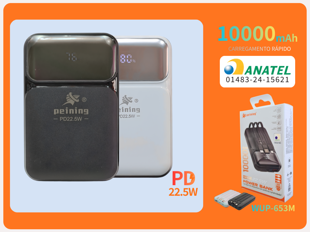 Saída USB padrão. Entrada Type-C USB, simples e fác de transportar.