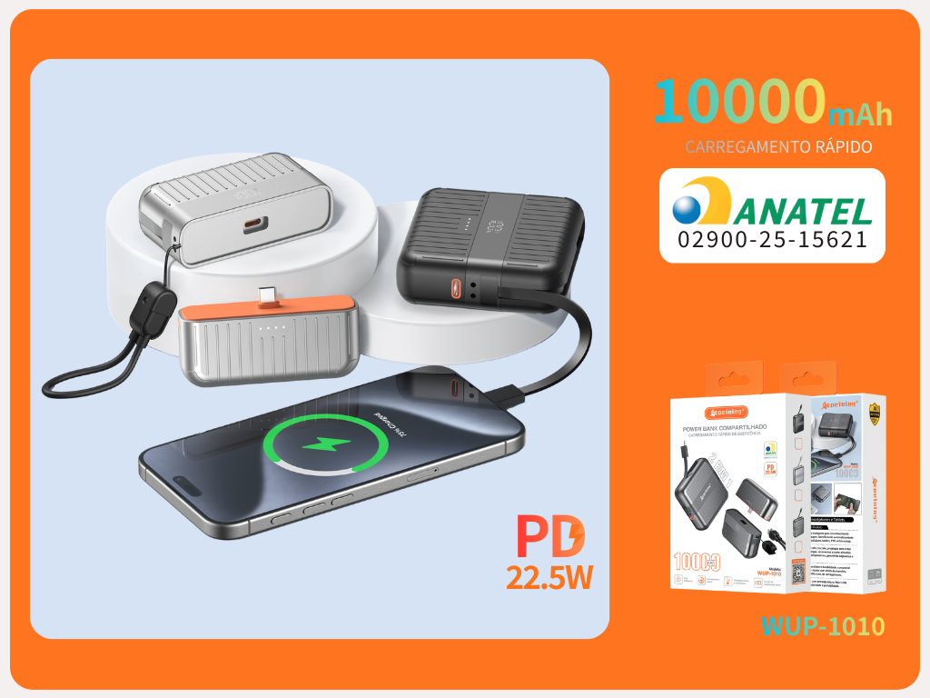 O Power Bank Peining WUP-1010 é um carregador portátil 2 em 1 com capacidade de 10.000 mAh, ideal para recargas rápidas de emergência. Com potência de saída de até 22,5 W (PD), ele conta com cabo integrado, visor digital para monitoramento da carga, certificação Anatel e proteção contra superaquecimento, garantindo segurança e praticidade no uso diário.